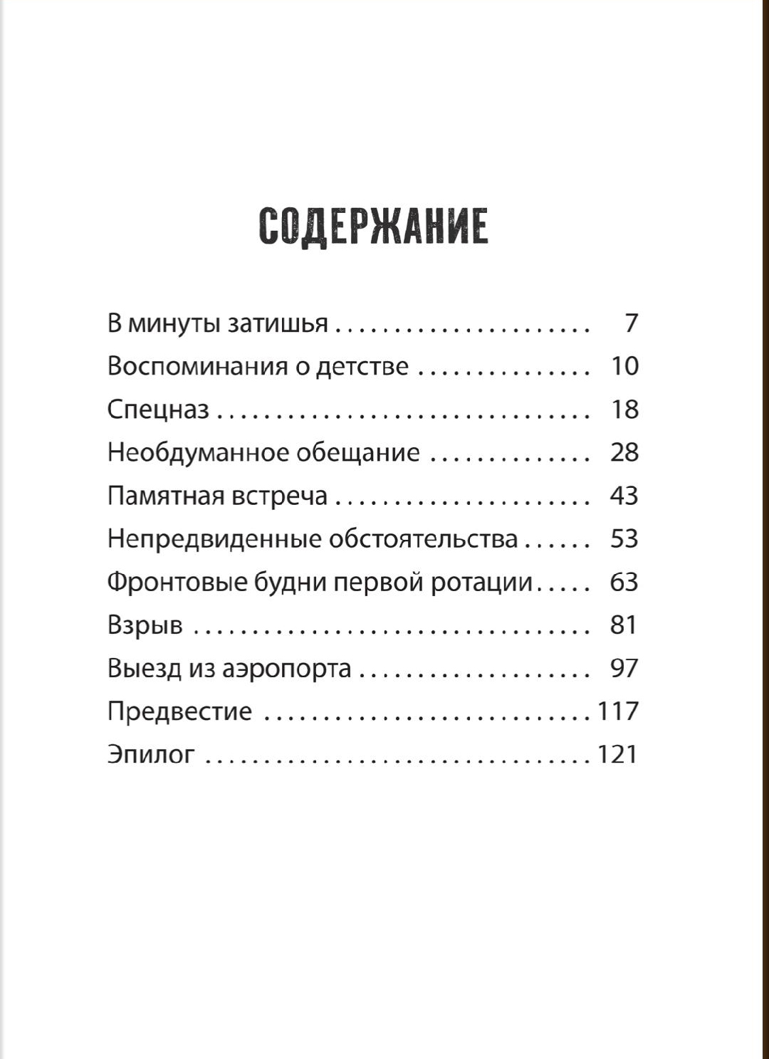 Эта биографическая повесть рассказывает о жизни Олега Маринченко, дьякона церкви евангельских христиан и военного капеллана. В книге описывается, как бывший спецназовец и комсомолец, разочаро-вавшись в советской идеологии и чуть не став участником бандитской группировки в 90-е годы, обратился к Богу после прочтения Нового Завета. Основная часть книги посвящена служению Маринченко в качестве капеллана в зоне боевых действий, в частности, в Донецком аэропорту в 2014 году, где он переживает обстрелы, получает ранение и помогает солдатам, укрепляя их дух. В повествовании подчеркивается, как его вера и молитва неоднократно спасали его и других бойцов от неминуемой гибели, а также его готовность продолжать служение, несмотря на опасности.
